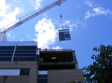 51,000 square feet of panelized curtainwall with composite metal panels and aluminum fins. The 6th floor rises past the roofline for a 22 foot tall water-tight curtainwall panel which is then encapsulated by an alluminum cornice providing additional water protection.